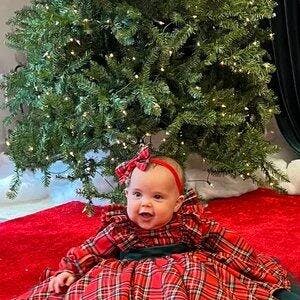 Festive red and green plaid Christmas dress with puff skirt, sleeves, green waistband and big bow. Elegant holiday outfit with ruffles.
