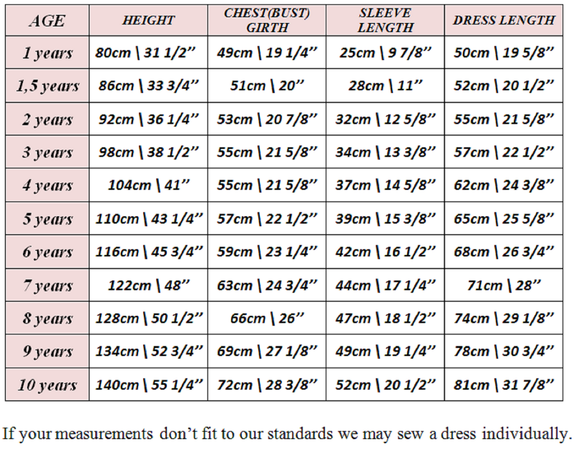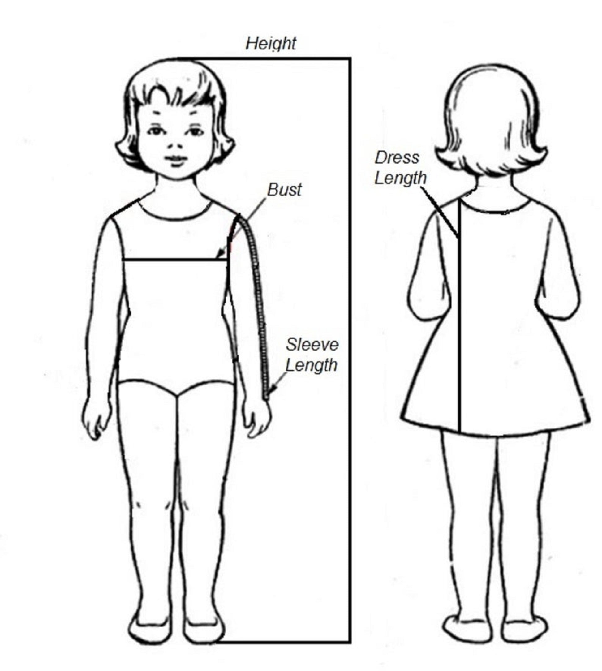 If your child’s measurements don’t match our standard chart, we can sew a custom dress for you. Please provide: