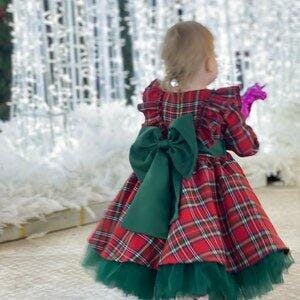 Make this holiday season unforgettable with our festive Christmas dress in classic red and green tartan. This elegant gown features long sleeves, a puffy skirt, and beautiful ruffles on the bodice. The design is completed with a green waistband and a large bow at the back, adding charm and holiday spirit.