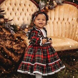 Celebrate the holiday season with this charming tartan Christmas dress for baby and toddler girls. Made from classic plaid fabric, this festive outfit features long sleeves, a full ruffled skirt with delicate white lace trim, and soft lace detail at the neckline. The design is both elegant and comfortable, making it perfect for winter celebrations.