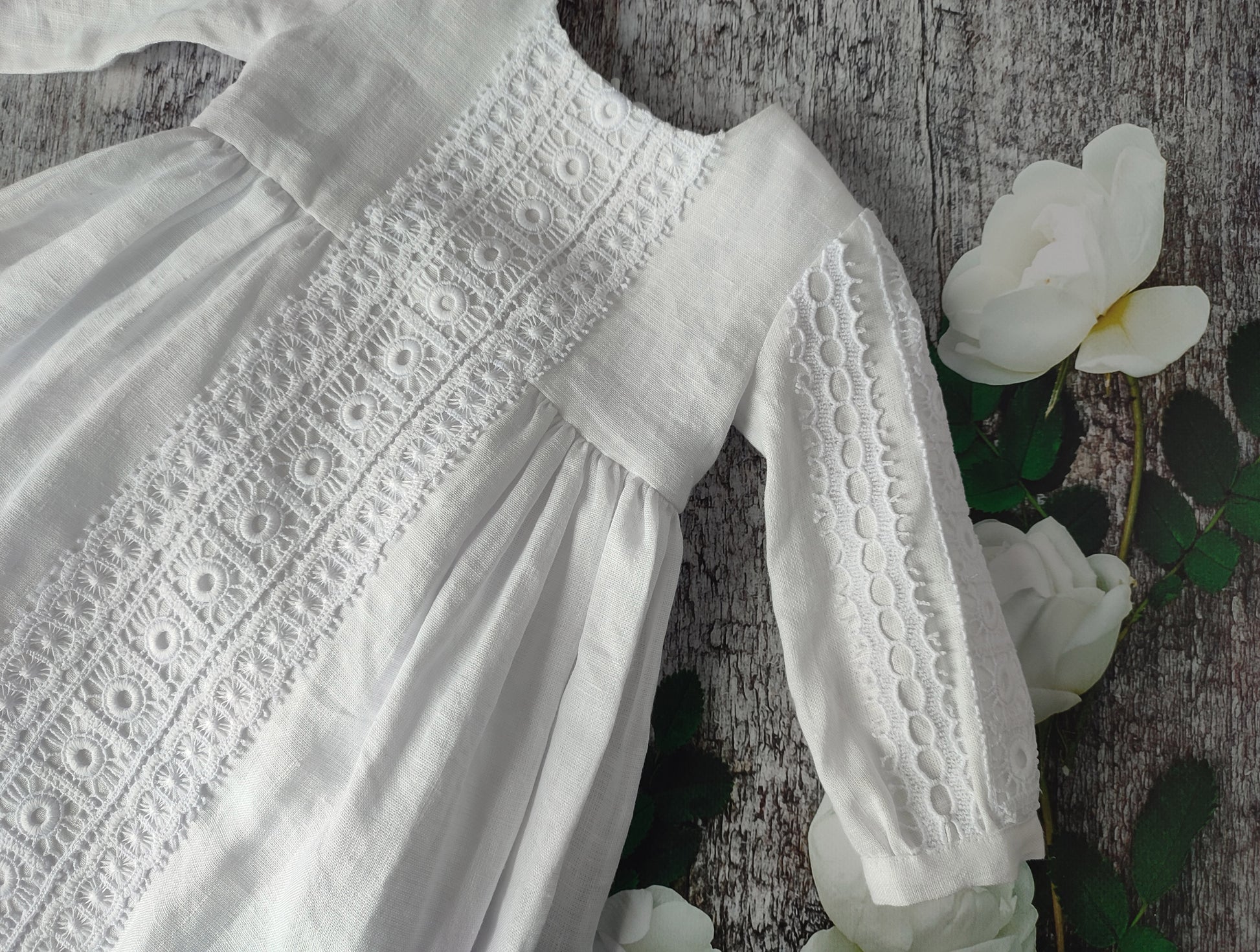 This timeless christening gown is crafted from 100% natural linen, offering a soft and breathable fit for both boys and girls. Perfect for newborns, this baptismal gown combines vintage charm with modern elegance, making it an ideal blessing gown for any special occasion. Its unisex design ensures it’s a cherished keepsake for generations to come.