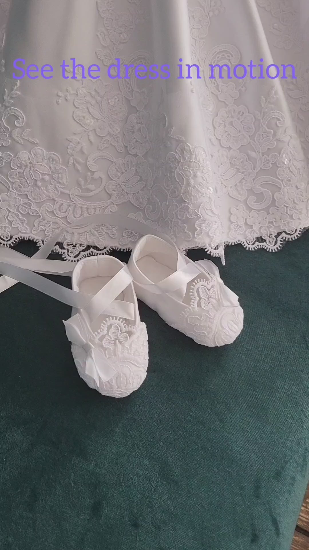 Complete the look with matching accessories — bonnet, headband, booties, and a stunning lace cape — each designed to perfectly complement this gown.